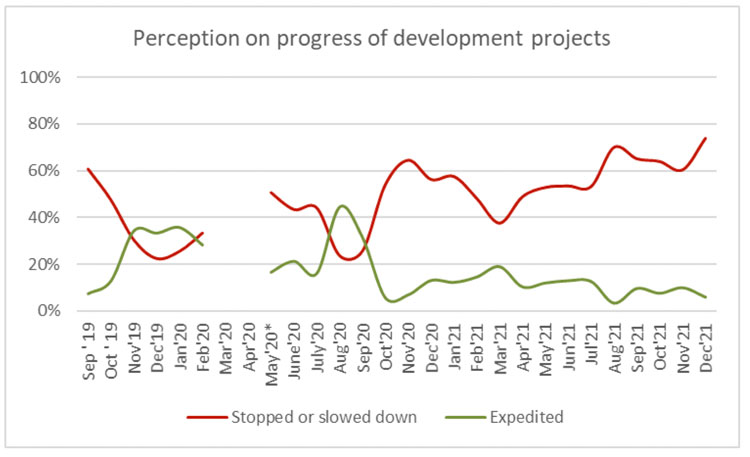 The period of two years is depicted here to indicate the movement of perception towards the presidential and parliamentary elections and thereafter. The negative perception of stopping or slowing down development projects fell dramatically from 60 percent to 20 percent with the change of presidency in November 2019 and again after the August 2020 general going up in the interim due most likely to the pandemic.