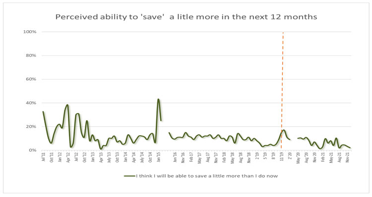 To assess the ability to manage the cost of living and to have something left over, we asked the respondents about their expected personal savings in the coming 12 months. The perception of the public’s ability to save a ‘little more’ than what they do at present has fallen to an all-time low of just 2.0 percent. This is a reflection on how desperate the people of Sri Lanka have become. As explained earlier, prices of food as well as non-food items have been increasing at a very rapid rate. Also, after many years, perhaps over two decades, the government imposed various quantitative restrictions on purchases from state owned outlets while certain items, such as milk powder, disappeared from the shelves of supermarkets.