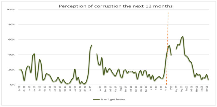 The question posed is if the respondents perceive that corruption will lessen in the coming 12 months.