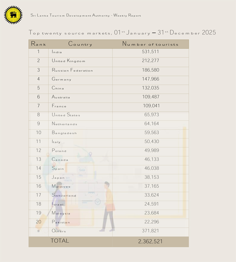 The strong performance highlights a sustained recovery and renewed momentum in Sri Lanka’s tourism sector, with 2025 setting a new benchmark for visitor arrivals.