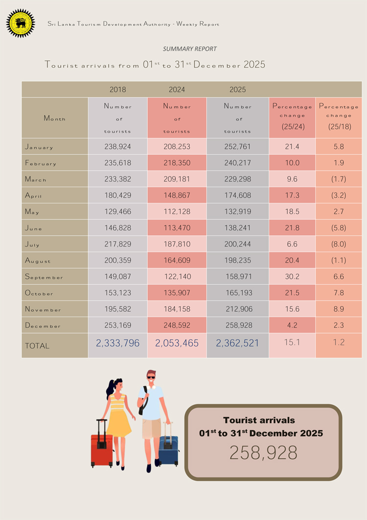 Meanwhile, December 2025 also marked a significant milestone, recording the highest monthly tourist arrivals since 2018. A total of 258,928 tourists arrived in Sri Lanka during the month, according to the Authority’s latest data.