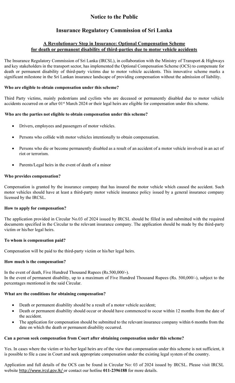 The Insurance Regulatory Commission of Sri Lanka (IRCSL), in collaboration with the Ministry of Transport & Highways and key stakeholders in the transport sector, has implemented the Optional Compensation Scheme (OCS) to compensate for death or permanent disability of third-party victims due to motor vehicle accidents. This innovative scheme marks a significant milestone in the Sri Lankan insurance landscape of providing compensation without the admission of liability.