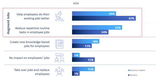 The study found that a majority of business leaders (62% of business leaders and 66% of workers) believe that AI will either help to do their existing jobs better or reduce repetitive tasks.
