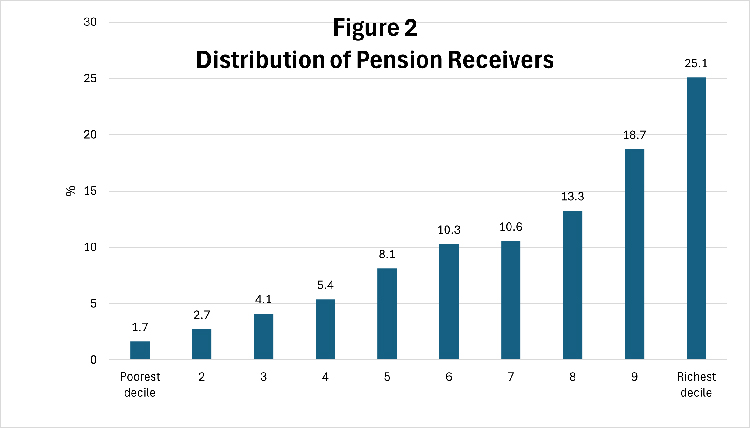 The better-off people enjoy the lion’s share of the PSP benefits. Employing a framework developed by the Commitment to Equity (CEQ), the distributional analysis shows that around 50% of PSP benefits go to individuals in the top 20% income bracket, while only 11% of the benefits reach the bottom 40% (Figure 1). This is mainly because PSP beneficiaries are from the better-off segment – around 44% of PSP receivers belong to the wealthiest 20% of the population (Figure 2). This analysis clearly shows that PSP is not a pro-poor spending programme.