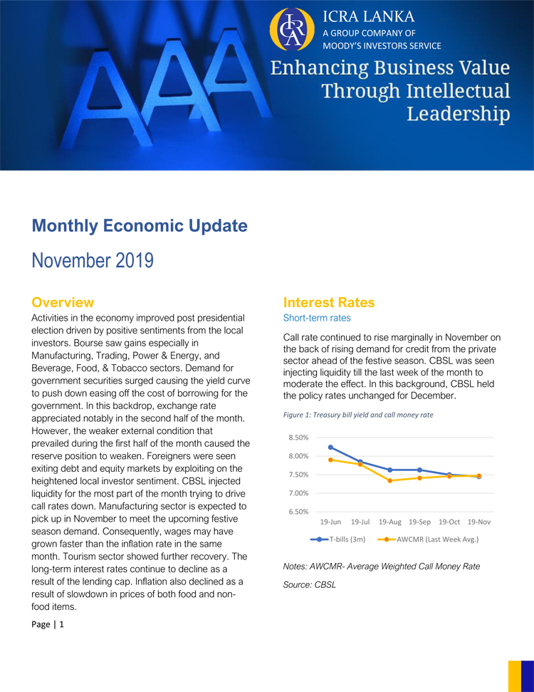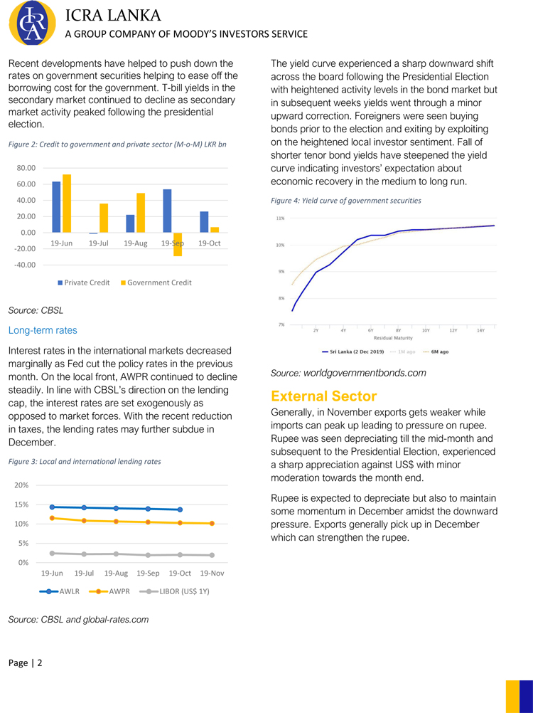 “Bourse saw gains especially in Manufacturing, Trading, Power & Energy, and Beverage, Food, & Tobacco sectors. Demand for government securities surged causing the yield curve to push down easing off the cost of borrowing for the government,” ICRA Lanka Limited, subsidiary of ICRA limited, a group company of Moody’s Investors Service