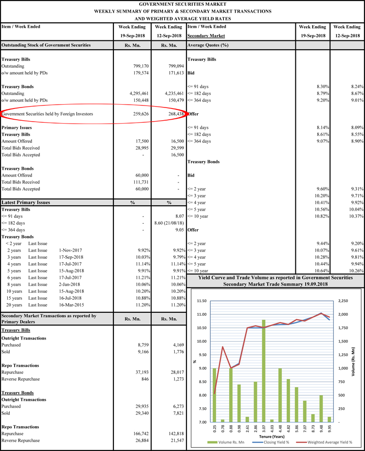 The latest data from the Central Bank of Sri Lanka points out that Foreigners had gradually exited from Sri Lanka’s Government Securities (Treasury Bills and Treasury Bonds) and pulled out over Rs. 8.8 billion in a week, during the period from 12thSeptember to 19th September 2018.