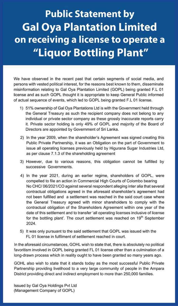 Gal Oya Plantation Limited (GOPL), a majority government-owned entity, has issued a public statement clarifying the circumstances surrounding its recent receipt of an FL 01 license to operate a liquor bottling plant. The company states the license was granted as part of a court-mandated settlement and not due to political favoritism, countering what it calls "misinformation" being circulated on social media by individuals with "vested political interests."