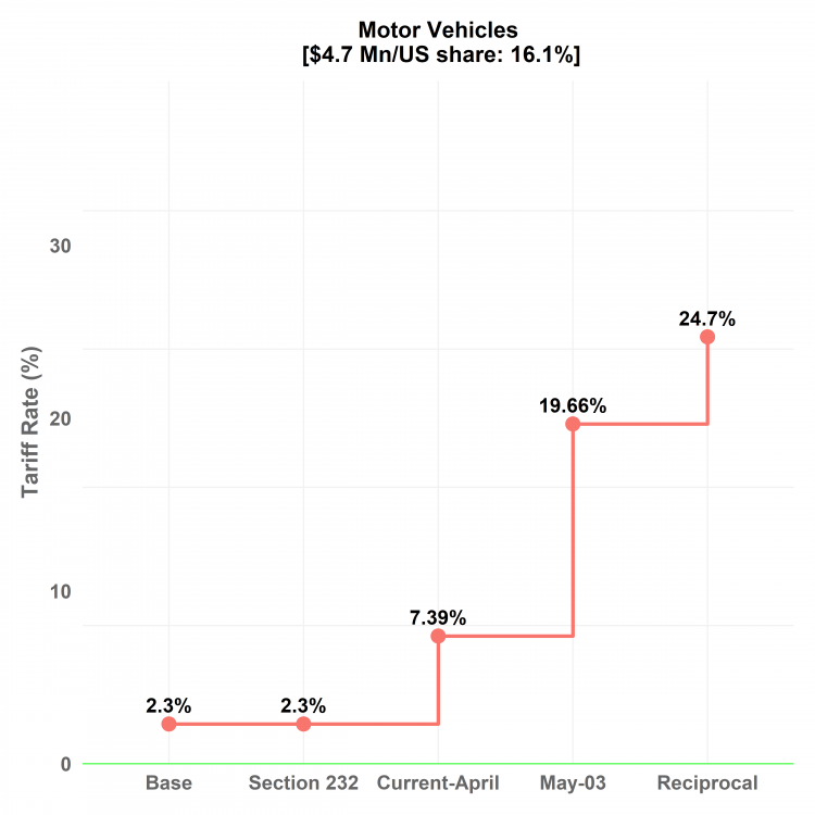 The US also announced tariffs on automobiles and parts on March 26 and enacted auto tariffs on April 03. However, the tariffs on automobile parts were delayed to a future date not later than May 03, 2025. The auto components account for 0.5% or USD 10.9 Mn exports by Sri Lanka. New pneumatic radial tyres, non-cellular vulcanised rubber articles, and electric control apparatus are among the products subject to auto component tariffs. As shown in Figure 2, the effective weighted average tariff for motor vehicle sector exports from Sri Lanka to the US will increase to 19.66% on May 03.