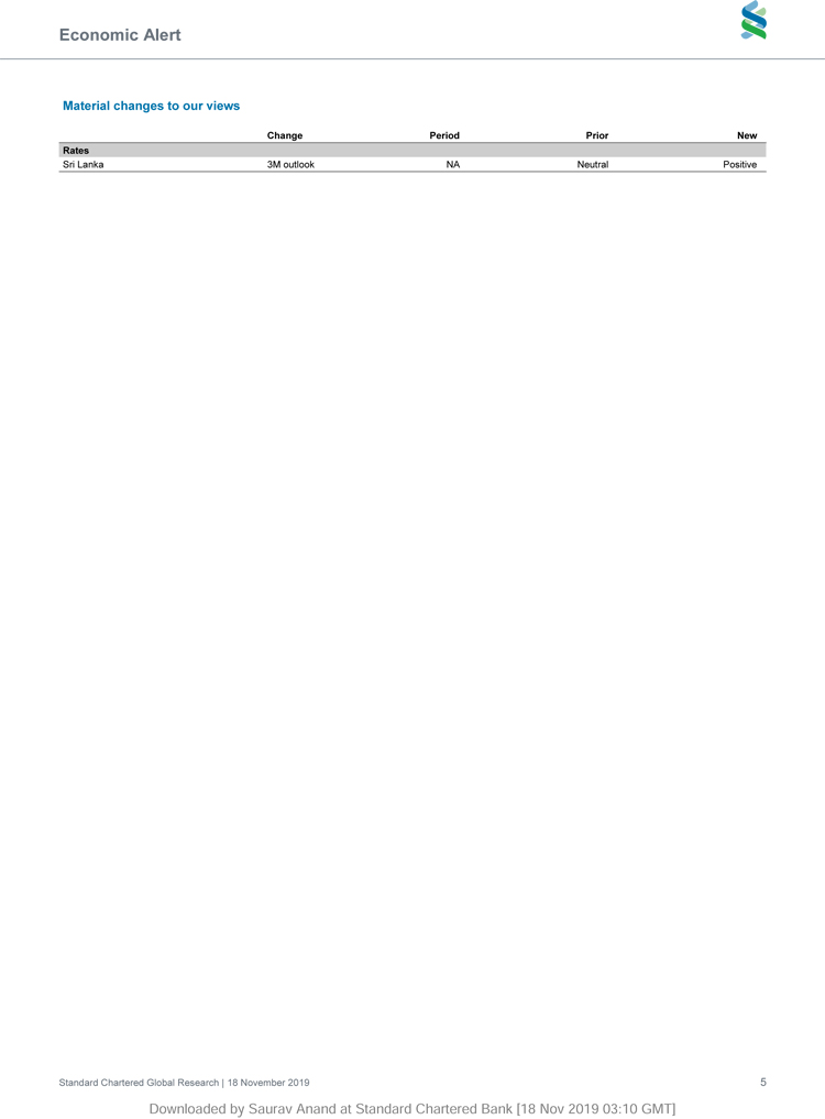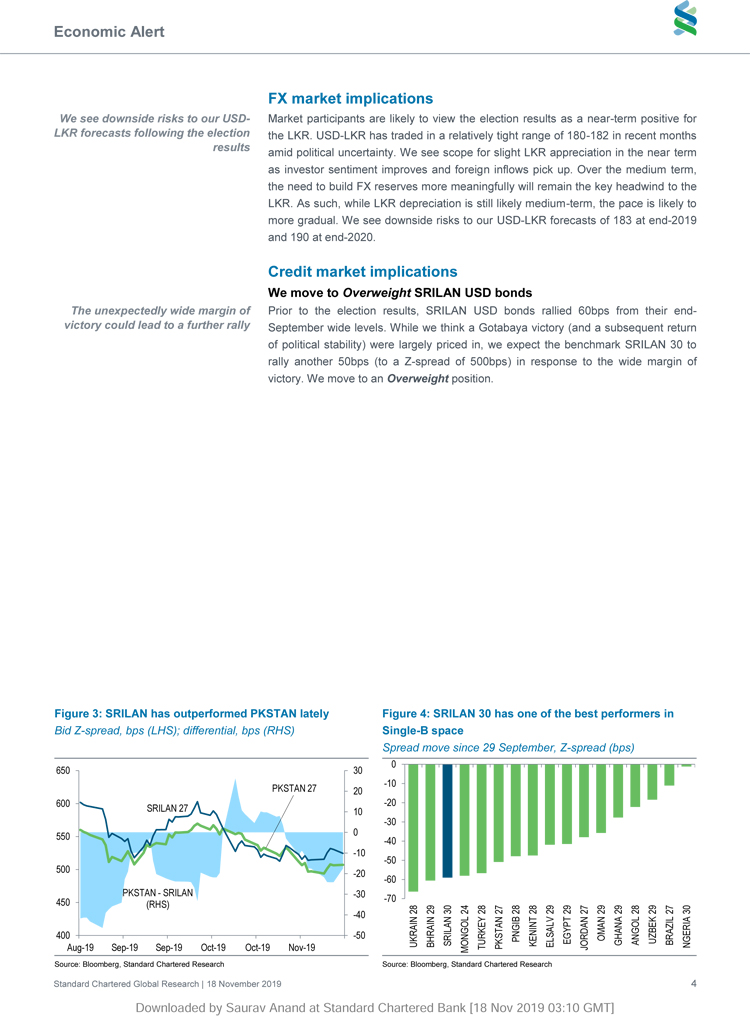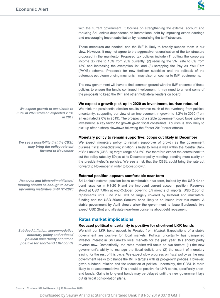 “We expect a 50bps policy rate cut in December. Growth is likely to pick up in 2020 as private investment regains momentum and recovers from this year’s Easter terrorist attacks. We turn Positive (from Neutral) on LKR bonds given subdued inflation, reduced political uncertainly and accommodative monetary policy. More clarity on fiscal policy is needed to catalyse a more decisive move in long-end bonds,”