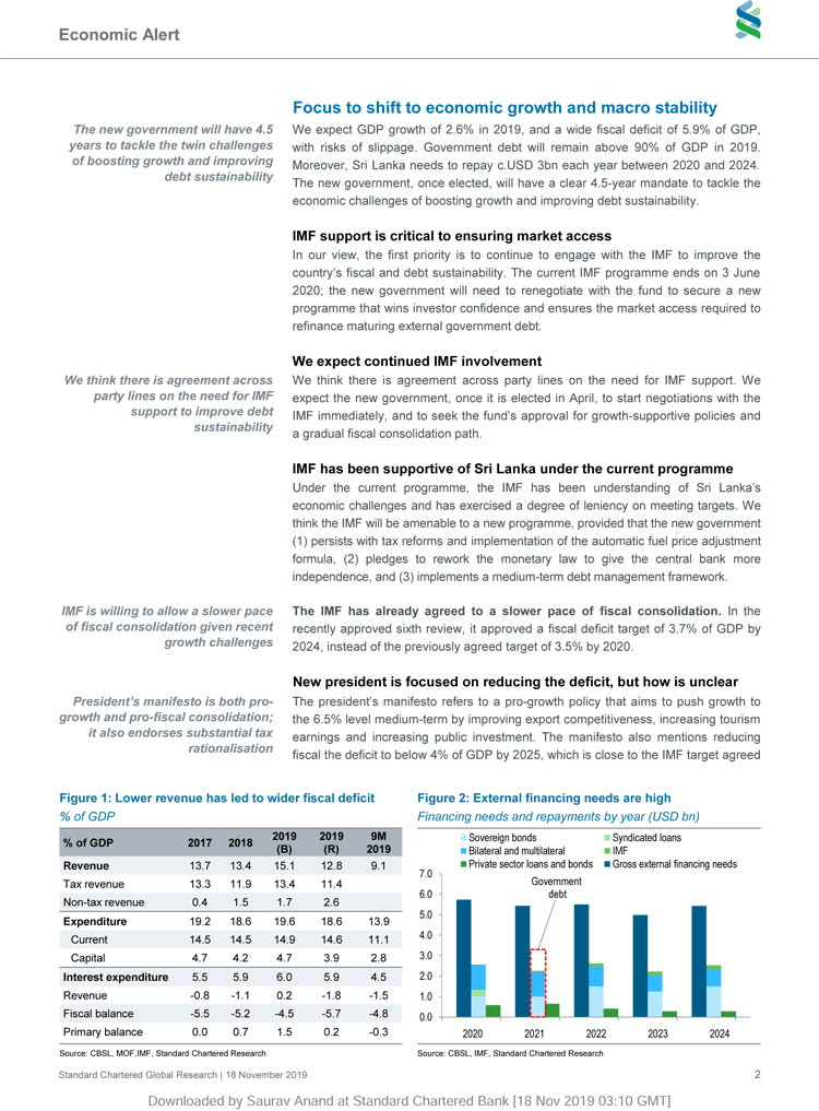 “We expect GDP growth of 2.6% in 2019, and a wide fiscal deficit of 5.9% of GDP, with risks of slippage. Government debt will remain above 90% of GDP in 2019. Moreover, Sri Lanka needs to repay c.USD 3bn each year between 2020 and 2024. The new government, once elected, will have a clear 4.5-year mandate to tackle the economic challenges of boosting growth and improving debt sustainability.”