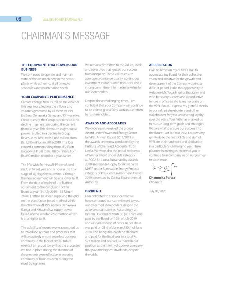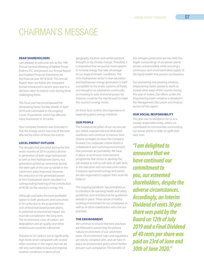 “Pollution in Sri Lanka is not at significantly high levels when compared with several other countries in the region, but we are still very vulnerable to local and regional weather conditions in terms of our geography, location and rainfall patterns brought on by climate change. Therefore, it is imperative that we pursue more options in renewal energy that take advantage of our tropical climatic conditions,” Vallibel Power Chairman Dhammika Perera told shareholders in the annual report 2019/20.
