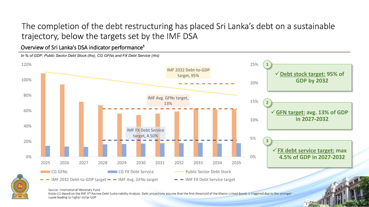 On the commercial side, the government completed a US$ 10.6 billion International Sovereign Bond exchange in December 2024, with 98% of bondholders participating. Debt treatment discussions are still ongoing with SriLankan Airlines bondholders and other minor commercial creditors.