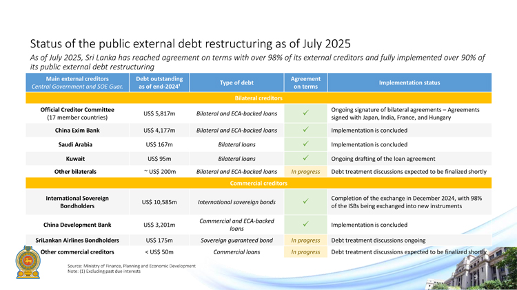 Sri Lanka has reached agreement on terms with more than 98% of its external creditors and fully implemented over 90% of its public external debt restructuring as of July 2025, according to the Ministry of Finance, Planning and Economic Development.