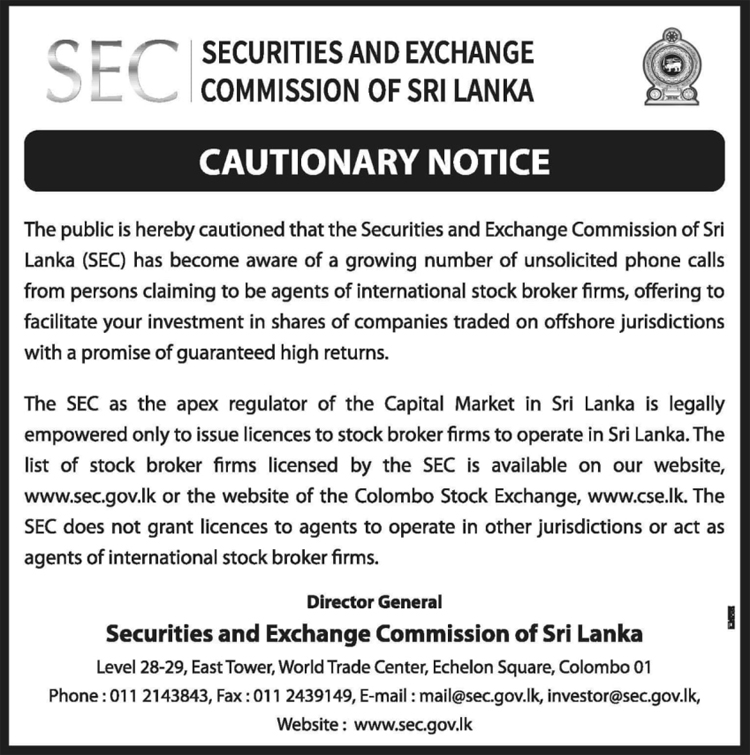 Issuing a notice the Director-General of the Security and Exchange Commission of Sri Lanka (SEC) warned the public with regard to a  growing number of unsolicited phone calls from persons claiming to be agents of international stock broker firms, offering to facilitate investment in the share of companies traded on offshore jurisdictions with a promise of guaranteed high returns.