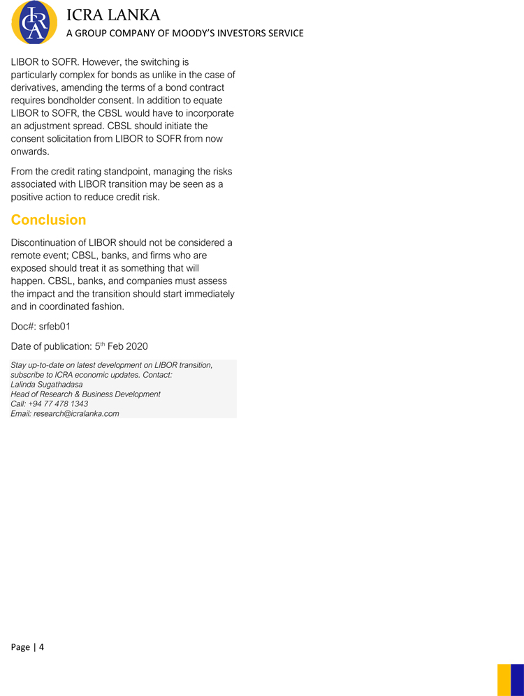 “Discontinuation of LIBOR should not be considered a remote event; CBSL, banks, and firms who are exposed should treat it as something that will happen. CBSL, banks, and companies must assess the impact and the transition should start immediately and in coordinated fashion,” ICRA Lanka added.