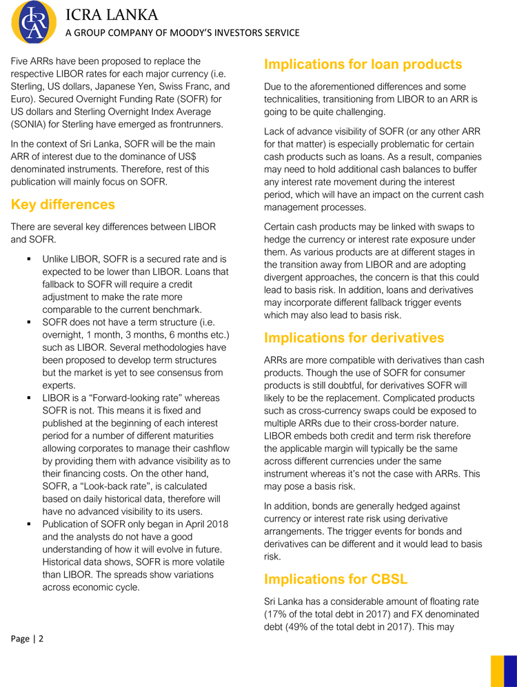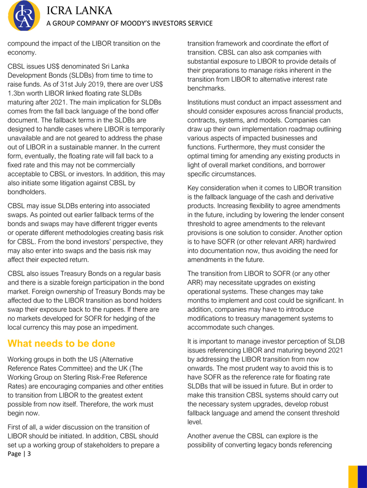 ICRA Lanka Limited, subsidiary of ICRA Limited, a group company of Moody’s Investors Service urges CBSL and Sri Lankan companies, including some of the biggest SOEs to get ready for the London Interbank Offered Rate (LIBOR) transition which is scheduled for 2021.