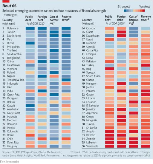 According to The Economist, Russia, Peru, and the Philippines look relatively robust while 30 are in distress or flirting with it including Sri Lanka.