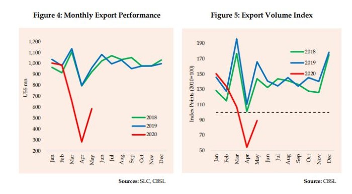 Earnings from the three major export sectors declined on a year-on-year basis, with industrial exports declining the most and agricultural and mineral exports declining at a slower pace. Major exports such as textiles and garments, rubber products, petroleum products, food, beverages and tobacco declined in May 2020, though earnings from these sectors recovered to about one half of the monthly average value reported in 2019. However, led by a higher demand for personal protective equipment (PPE) such as face masks, protective suits, surgical gloves, etc., earnings from exports of other made up articles (categorised under textiles and garments) and surgical and other gloves (categorised under rubber products) grew significantly. Meanwhile, earnings from agricultural exports declined, led by lower volumes of tea exports due to lower domestic production, despite higher average export prices for tea recorded in the international market. Earnings from coconut exports declined, led by lower volumes of coconut kernel products, though exports of non-kernel products increased. Exports of minor agricultural products improved in May 2020 mainly led by the export of arecanuts.