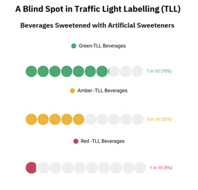 A recent IPS assessment of SSB labelling reveals that around 70% of green-labelled SSBs and 50% of amber-labelled ones contain NSS. While these reformulations help products meet sugar thresholds, they contain artificial sweeteners and may pose long-term health risks.