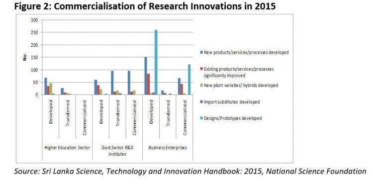 When compared with 2013, there is an increase in commercialisation of innovations in the government and higher education sector by nearly 68 %, however, business enterprise data are not available. Nevertheless, Sri Lanka is not at a satisfactory level when compared with its peers in South and East Asia. According to GII 2020, knowledge and technology outputs which take innovation and commercialisation into consideration, Sri Lanka was ranked at 68 out of 131 countries, whereas Singapore was at 14th, India at 27th and Malaysia at 38th places, respectively.