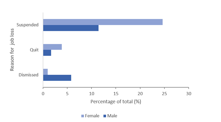 Abrupt job losses too led to severe financial consequences. Estimates based on the COVID-19 impact survey data suggest that, in the initial phase, 24% of women and 11% of men employed in the industry experienced job suspensions due to temporary factory closures (figure 1). In contrast, the same statistic for all female workers in similar occupational categories across all sectors, was 11.3% while for male workers it was 12.8%. When the apparel factories restarted in May 2020, temporary workers, especially those who were part-time workers and line helpers, faced job suspensions without benefits as revealed in discussions. They were unable to find alternative employment and faced significant economic hardships.
