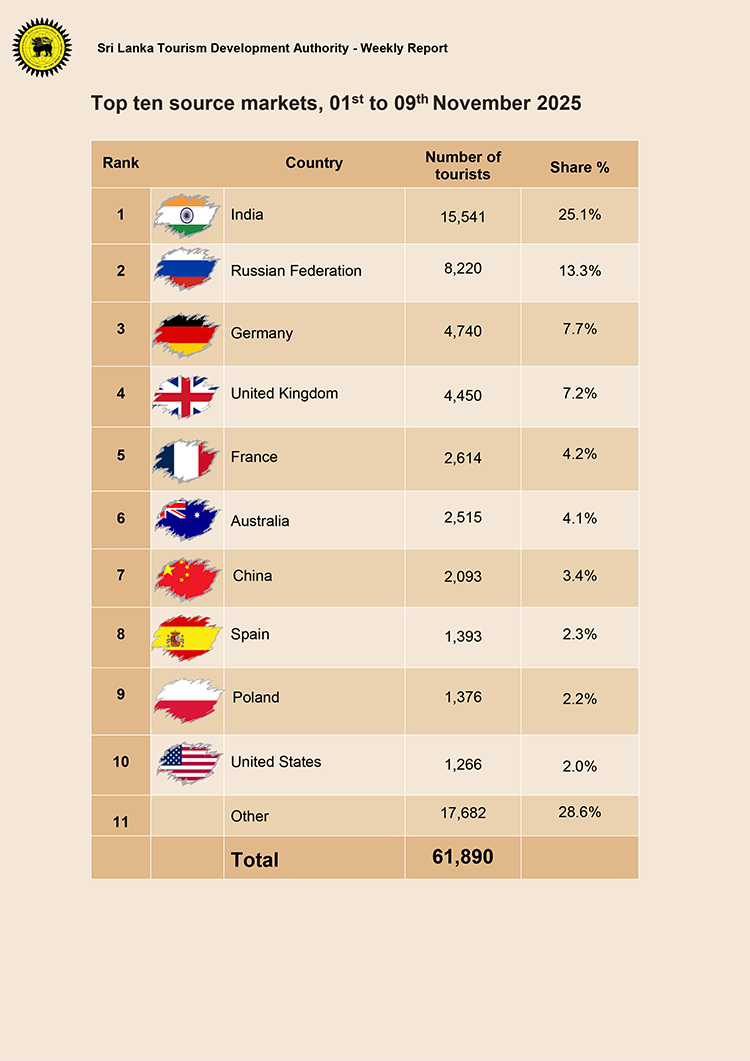 According to data released by the SLTDA, a total of 15,541 tourists have arrived from India which accounts to 25.1%. Furthermore, 8,220 persons from Russia, 4,740 from Germany, 4,450 from the United Kingdom and 2,614 French nationals have also visited Sri Lanka in the month of November.