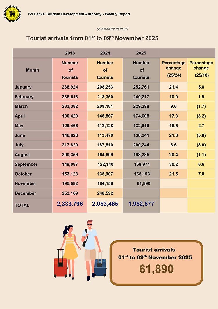 Meanwhile, the number of tourists arrived in Sri Lanka in 2025 has increased to 1,952,577 with the release of the latest figures for November.