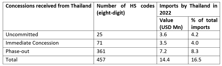 Similarly, of the 154 six-digit HS codes identified as Sri Lanka’s offensive list, Thailand’s tariff schedule contains 457 such products at eight-digit HS codes. Unlike Sri Lanka though, only 25 such products are on Thailand’s uncommitted list, accounting for 3.6% of Thailand’s imports from Sri Lanka in 2022. Additionally, although Thailand puts 12 ready-made garment products (USD 3.6 Mn or 4.2% of imports) from Sri Lanka’s offensive list in its uncommitted list, 130 offensive list products (USD 3.6 Mn or 4.2% of imports) from HS chapters 61 and 62 will see tariffs phased-out. Out of these 130, Thailand did not import 68 products in 2022 from Sri Lanka.