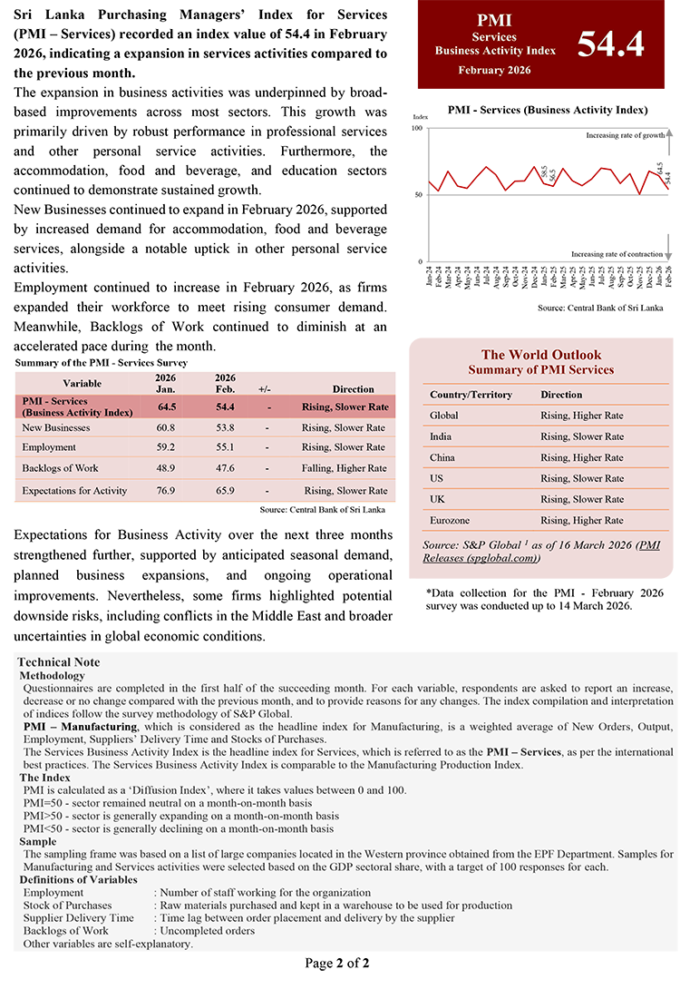 Sri Lanka Purchasing Managers’ Index for Services (PMI – Services) recorded an index value of 54.4 in February 2026, indicating a expansion in services activities compared to the previous month.