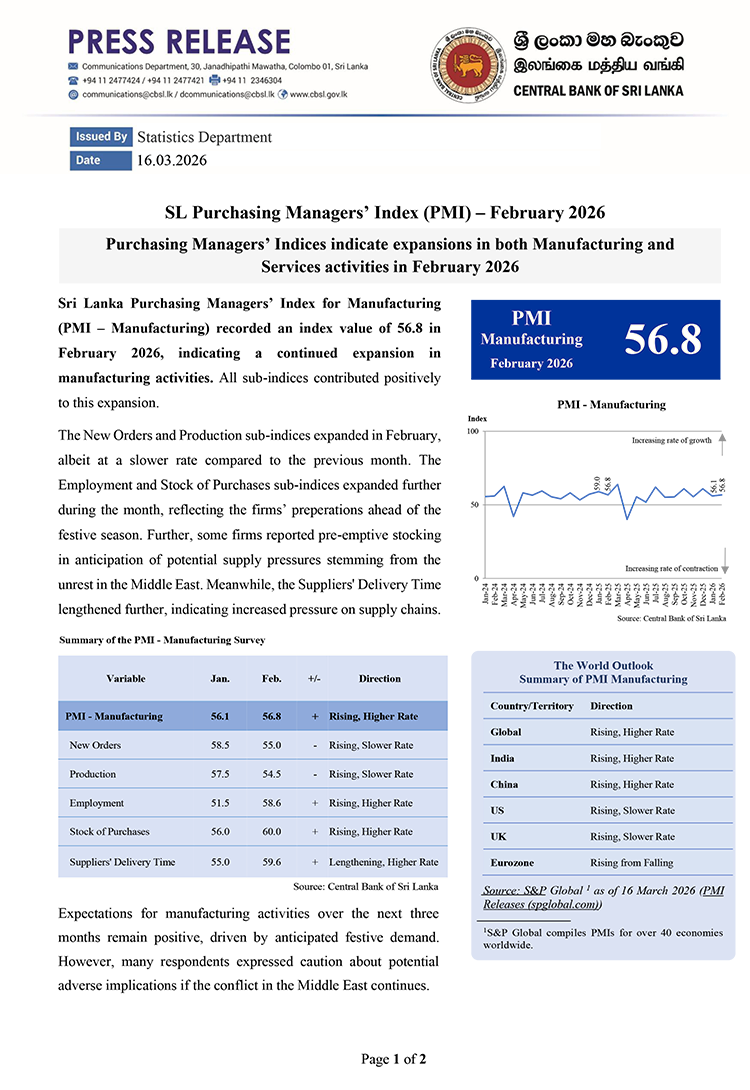 Sri Lanka Purchasing Managers’ Index for Manufacturing (PMI – Manufacturing) recorded an index value of 56.8 in February 2026, indicating a continued expansion in manufacturing activities. All sub-indices contributed positively to this expansion.