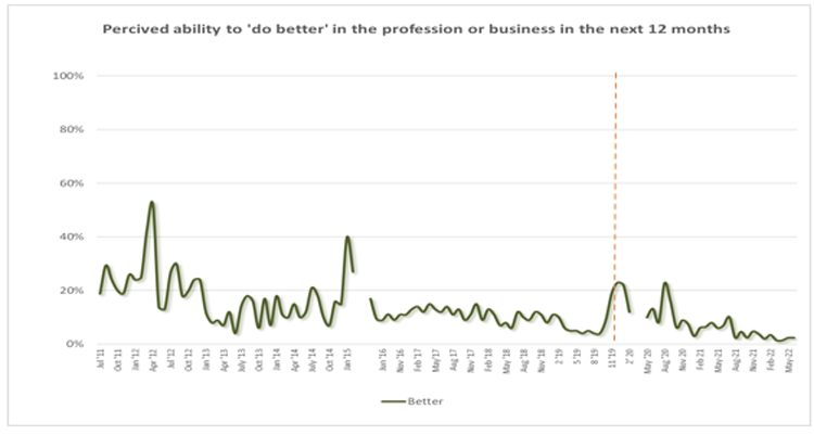 Optimism having hit the lowest it has ever been, at just 1.0 percent at the end of March 2022 picked up to 2.0 percent in April and rose to 3.0 percent in May after Ranil Wickremesinghe was appointed the new PM. But perception of economic opportunity dropped to 2.0 percent again in June. These numbers suggest that the removal of the sitting PM and replacing the position with the new PM only had a very marginal impact on optimism. The reason for falling hope is most likely because the new administration was not able to make any significant improvements in the general economic situation. By mid-April the public began to understand in small measure the gravity of the economic situation when the Minister of Finance announced to the world that Sri Lanka was unilaterally suspending its foreign debt payments. It is ironic that till that day the government had painted a false picture of the nation’s economy promising repayment of all debts and pretending the situation was under control. It was revealed later that on that fateful mid-April evening the Central Bank only had USD 50m in usable reserves thus had no way to make interest payments close to some USD 200m on outstanding foreign currency debt.