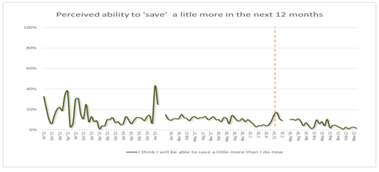 Here our objective is to determine the perceptions on the ability to save; an inadvertent way to estimate cost of living as well. To assess the ability to manage the cost of living and to have something left over, we asked the respondents about their expected personal savings in the coming 12 months. After the perception of the public’s ability to save a ‘little more’ than what they do at present fell to an all-time low of a mere 1.0 percent at the end of the first quarter this figure rose to 2.0 percent in April, to 3.0 percent in May and fell back to 2.0 percent in June. The below chart reflects how difficult it has been for the people of Sri Lanka over the last decade.