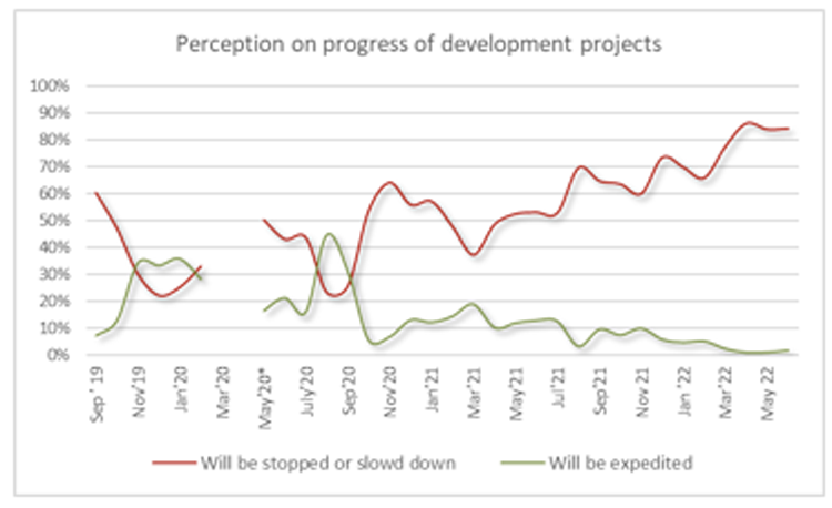 The public do not expect development projects to be implemented anytime soon. We present here the trend in the perception on the progress of development activity in the coming twelve months. The positive perception of continuing or expediting development projects is at a mere 1.0 and 2.0 percent during the quarter.