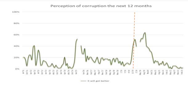 The question posed is if the respondents perceive that corruption will lessen in the coming 12 months. It is evident that the hope for reduced corruption post the two elections is completely gone.