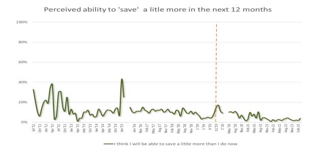 To assess the ability to manage the cost of living and to have something left over, we asked the respondents about their expected personal savings in the coming 12 months. By the end of 2002 those who thought they could save a little more than at present were at a low of 1.4 percent. But as inflation began to fall, albeit slowly, this perception gradually rose to 3.8 percent. It is relevant to note that inflation in Sri Lanka was in the mid-single digits for a very long time before suddenly increasing to dizzy heights with the total mismanagement of the economy.
