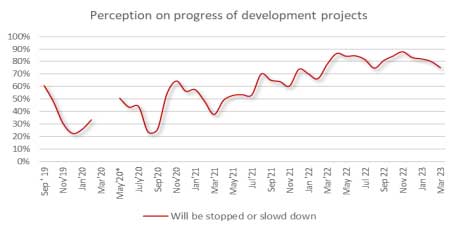 On an ad hoc basis, we consider certain other aspects of public perception. For some time now we have considered ‘development projects’ here interpreted as large construction-related mega projects. As far as the public is concerned, they do not see development projects coming back on stream for a long time to come. However, towards the end of the first quarter 2023 there seems to be some level of optimism that projects may start again with the perception on the progress of development activity would stop or slow down in the coming twelve months falling to 75 percent from 85 percent.