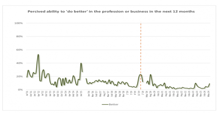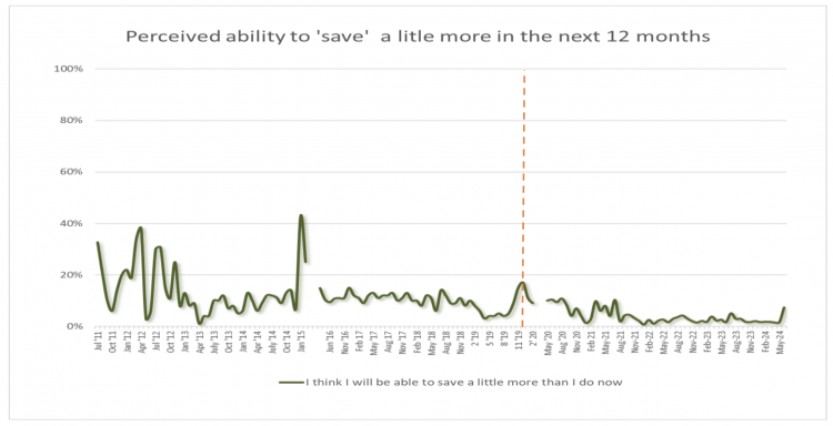 By the end of 2022 those who thought they could save a little more than at present were at a low of 1.4 percent. But as inflation began to fall this perception gradually rose to 3.8 percent by the end of the first quarter 2023 and with inflation falling rapidly it increased to 5.1 percent in July but fell again to 2.9 percent by September 2023 with increasing taxes and utilities. It had fallen to 2.0 percent by end December 2023. Throughout the first quarter of 2024, people’s ability to save little more remained at just 1.7 percent in March. The second quarter started out same at 1.5 percent in April, increasing to 1.6 percent in May and shooting up to 7.3 percent in June; the highest since July 2021. This is reflective of the optimism we saw in the previous chart.