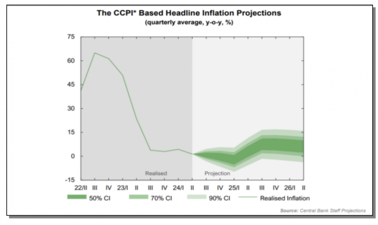 In terms of expenses, and as seen in the Central Bank of Sri Lanka (CBSL) actual and projected inflation chart as at the end of the second quarter 2024, inflation, or rate at which expenses were increasing, began to fall rapidly since the unprecedented high of 65 percent to under 2.0 percent while projection for the next 12 months remains reasonably low within the 50 percent confidence interval. With the passage of the new Central Bank Act, the government and the CBSL have agreed on a 5.0 percent target for the coming three years.
