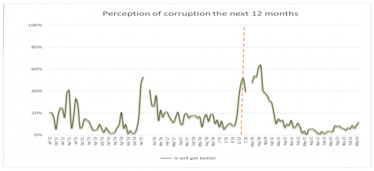 The perception of reducing corruption rose to 8.6 percent at the end of third quarter 2023. This was very likely the result of government and opposition coming together to agree on legislation on the new anti-corruption Act in line with global best practices. However, that sentiment had reduced somewhat with the figure falling to 4.8 percent by end of the fourth quarter but rose again during the first quarter 2024 due most likely due to the arrest of a sitting cabinet minister; Keheliya Rambukwella on charges of misappropriation in procuring medicines and medical equipment during the crisis. To this date he remains in remand custody as his many cases are being heard. As with the previous improvements in sentiment, the perception on fighting corruption also improved. In April it started at 6.7 percent. It improved to 9.4 percent in April and to 12.1 percent in June. This is a positive sign.