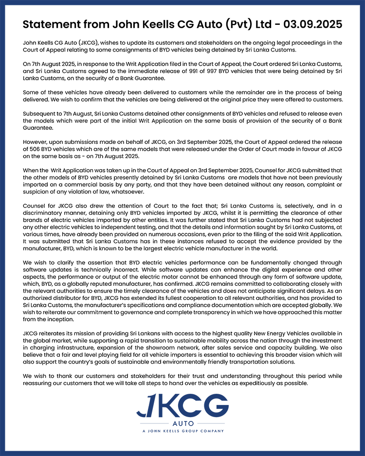 John Keells CG Auto (JKCG), wishes to update its customers and stakeholders on the ongoing legal proceedings in the Court of Appeal relating to some consignments of BYD vehicles being detained by Sri Lanka Customs.