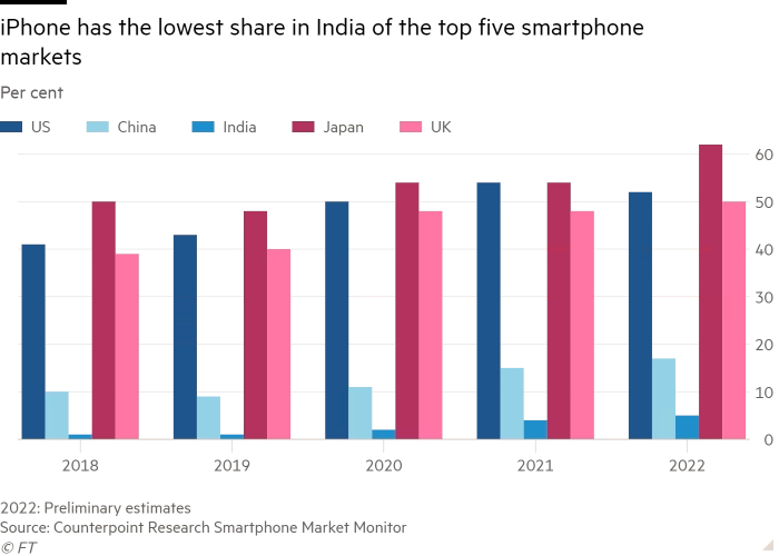 India will also overtake China as the world’s most populous country this year, but Apple’s share of the world’s third-largest smartphone market is small — at just under 5 per cent of handsets sold last year.