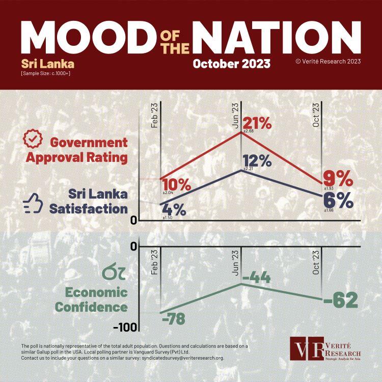 The approval rating of the government fell from 21% in June 2023 to 9% in October 2023 according to the latest round of the Gallup style ‘Mood of the Nation’ poll of Verité Research.