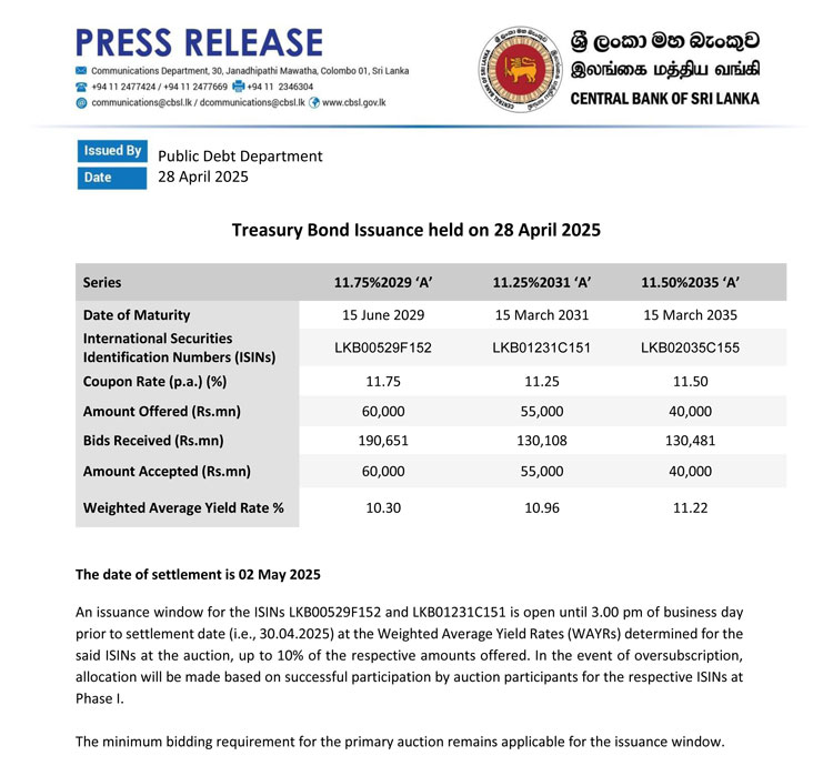 Sri Lanka’s Public Debt Department successfully raised Rs. 155 billion through its Treasury bond auction held on April 28, 2025, attracting robust investor interest across all maturities.
