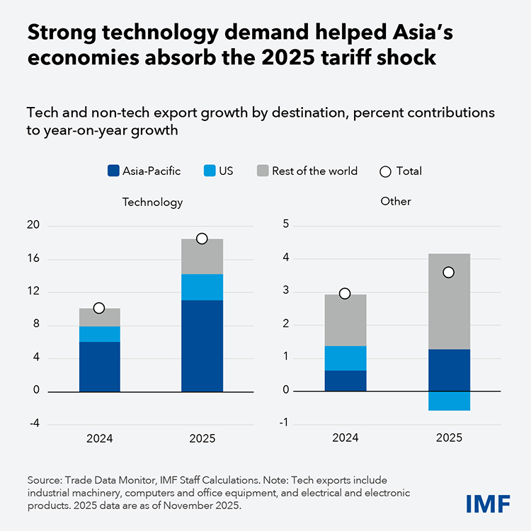 Growth across many economies in Asia was stronger than previously expected in the second half of last year, helped by the robust technology cycle, domestic policy support, and broadly accommodative financial conditions. Demand for semiconductors and related products remained strong, benefiting economies like Korea, Malaysia, and Singapore that are deeply integrated into tech supply chains. Trade within Asia picked up, while diversification toward the rest of the world helped cushion softer demand from the United States, especially for non-tech exports.