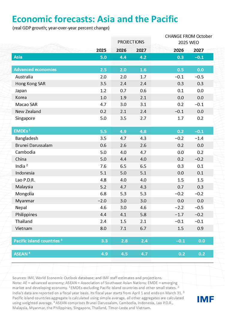 Inflation is also rising. In emerging Asia, inflation is projected to increase from 1.1 percent in 2025 to 2.6 percent in 2026, driven in part by upward revisions in China and India. In advanced Asia, the pickup is more mixed: inflation pressures have eased in Japan, but remain persistent in Australia, where the 2026 inflation forecast has been revised up significantly.
