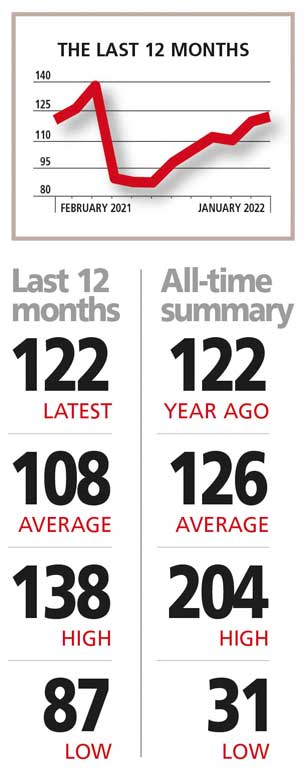 THE INDEX The BCI nudged upwards by three basis points from the previous month to register 122 in January. The index stands at where is stood a year ago and is a healthy 14 points above its 12 month average of 108.