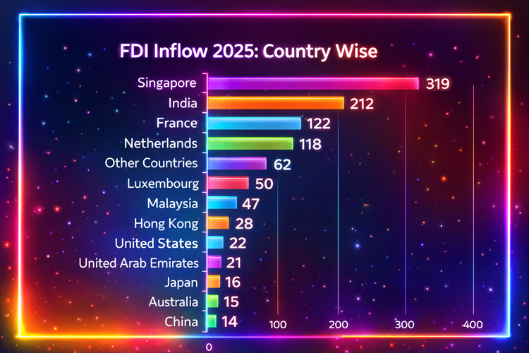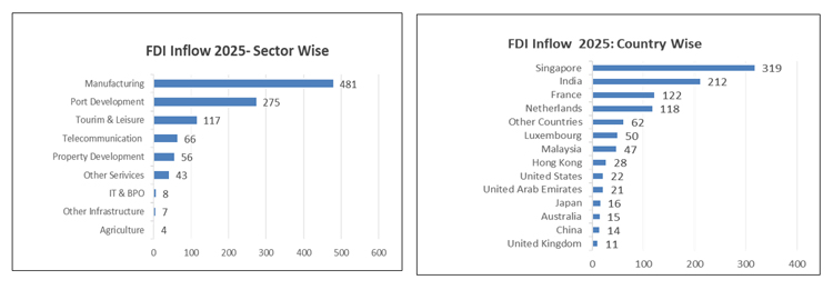 The manufacturing sector contributed 46% of FDI inflow followed by 26% by the Port Development sector and 11% by the Tourism sector. Singapore, India, France, Netherlands and Luxembourg have been recorded as the top five FDI sourced countries in 2025.