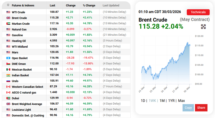 Reuters - Oil prices extended gains on Monday, with Brent headed for a record monthly rise, after Yemeni Houthis launched their first attacks on Israel over the weekend, widening the U.S.-Israel war with Iran in the Middle East.