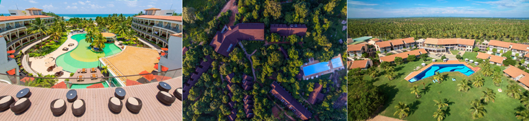 Photo captions: (Above) Dickwella Resort & Spa and (below – from left) The Eden Resort & Spa, The Paradise Resort & Spa and The Calm Resort & Spa