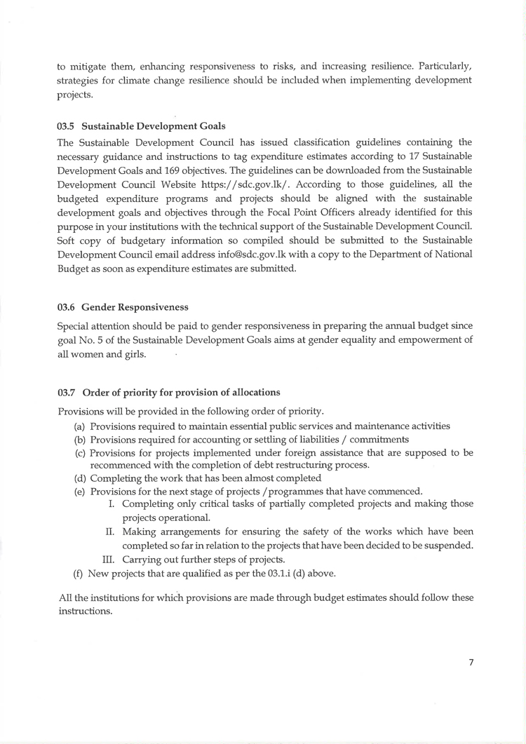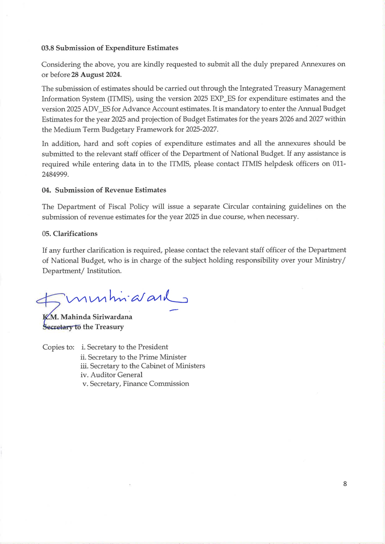 The Budget Call was communicated to Secretaries of Ministries, Chief Secretaries of Provincial Councils, Heads of Departments, Chairpersons of State Corporations, the University Grants Commission, and Statutory Commissions through a circular. This circular aims to provide the necessary guidelines to spending agencies for preparing expenditure estimates.
